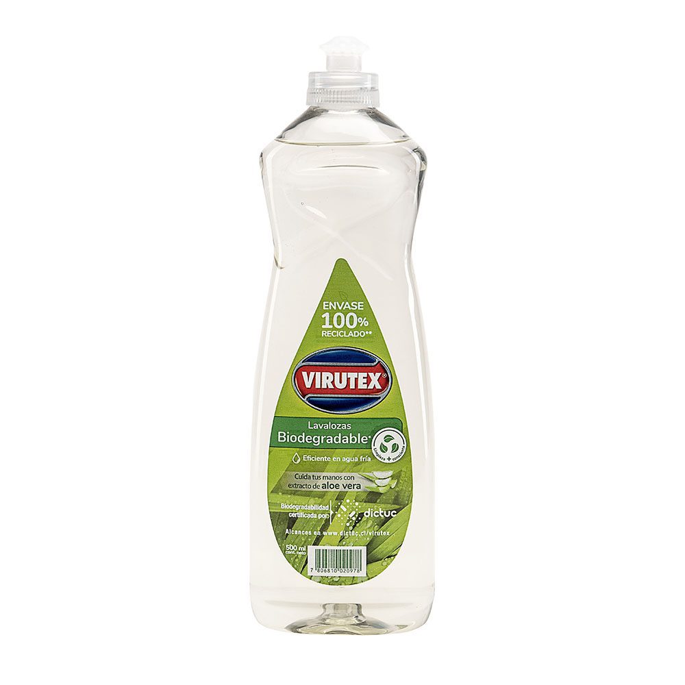 Virutex Lavalozas Biodegradable con Aloe Vera 500 ml – Detergente líquido concentrado para lavado de vajilla con alto poder desengrasante y fórmula biodegradable. Su composición libre de fosfatos y con extracto de aloe vera proporciona una limpieza eficiente de platos, ollas y utensilios, a la vez que cuida tus manos durante el lavado. Perfecto para uso doméstico, cocinas institucionales y áreas sensibles al impacto ambiental.