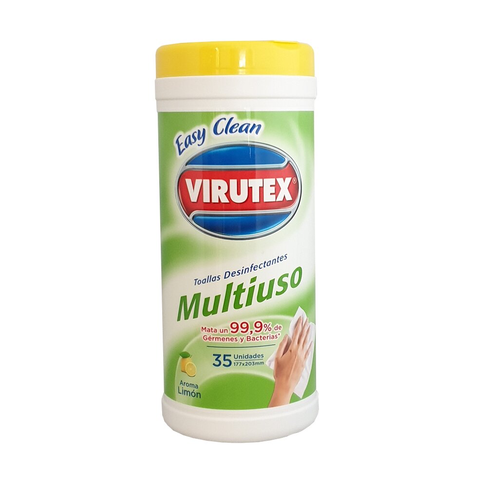 Toallas Desinfectantes Multiuso Virutex 35 Unidades – Paquete de toallitas húmedas desinfectantes diseñadas para limpiar, desinfectar y dejar tus superficies higienizadas sin necesidad de diluir ni enjuagar. Ideales para uso diario en cocinas, baños, escritorios, mesas, pomos de puertas, auto y cualquier superficie lavable, estas toallas combinan eficacia y practicidad en cada aplicación.
