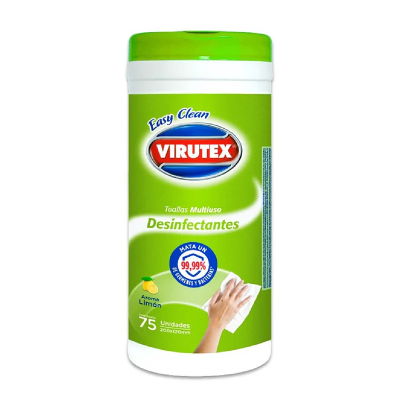 Toallas Desinfectantes Multiuso Virutex 75 Unidades – Paquete de toallitas húmedas desinfectantes diseñadas para limpiar, desinfectar y dejar tus superficies higienizadas sin necesidad de diluir ni enjuagar. Ideales para uso diario en cocinas, baños, escritorios, mesas, pomos de puertas, auto y cualquier superficie lavable, estas toallas combinan eficacia y practicidad en cada aplicación.