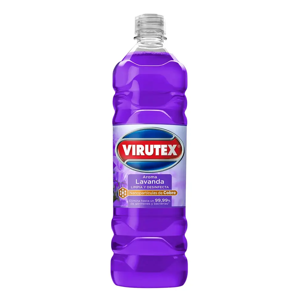 Virutex Limpiador Líquido Desinfectante Aroma Lavanda 1800 ml – Limpiador líquido desinfectante multi-superficies con fragancia lavanda, ideal para limpiar y sanitizar pisos, azulejos, baños, cocinas y otras superficies lavables. Formulado con nanopartículas de cobre, ayuda a eliminar hasta el 99,99 % de gérmenes y bacterias, dejando un ambiente limpio, seguro y con un agradable aroma a lavanda. Perfecto para uso doméstico, oficinas, locales comerciales y espacios con tránsito frecuente.